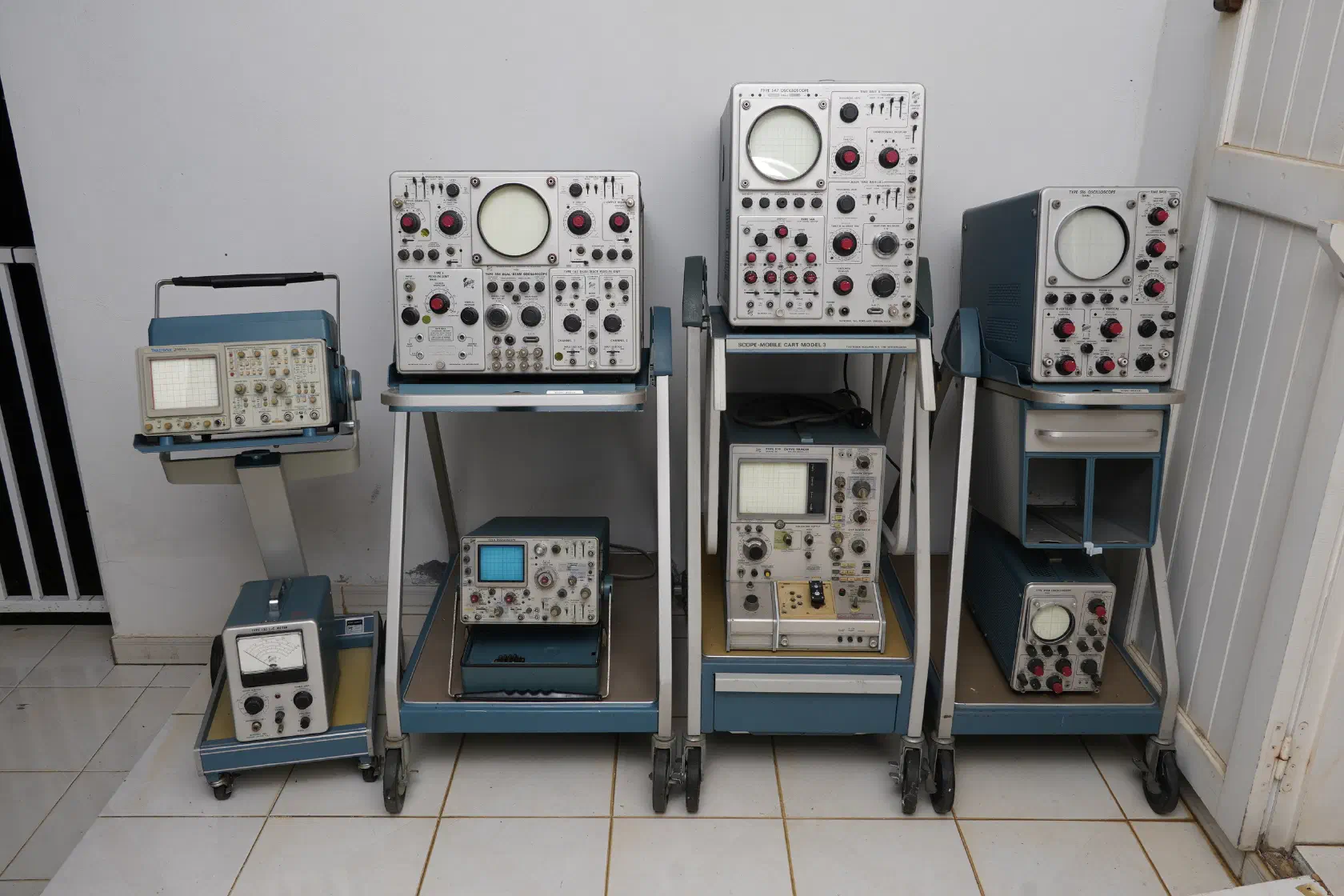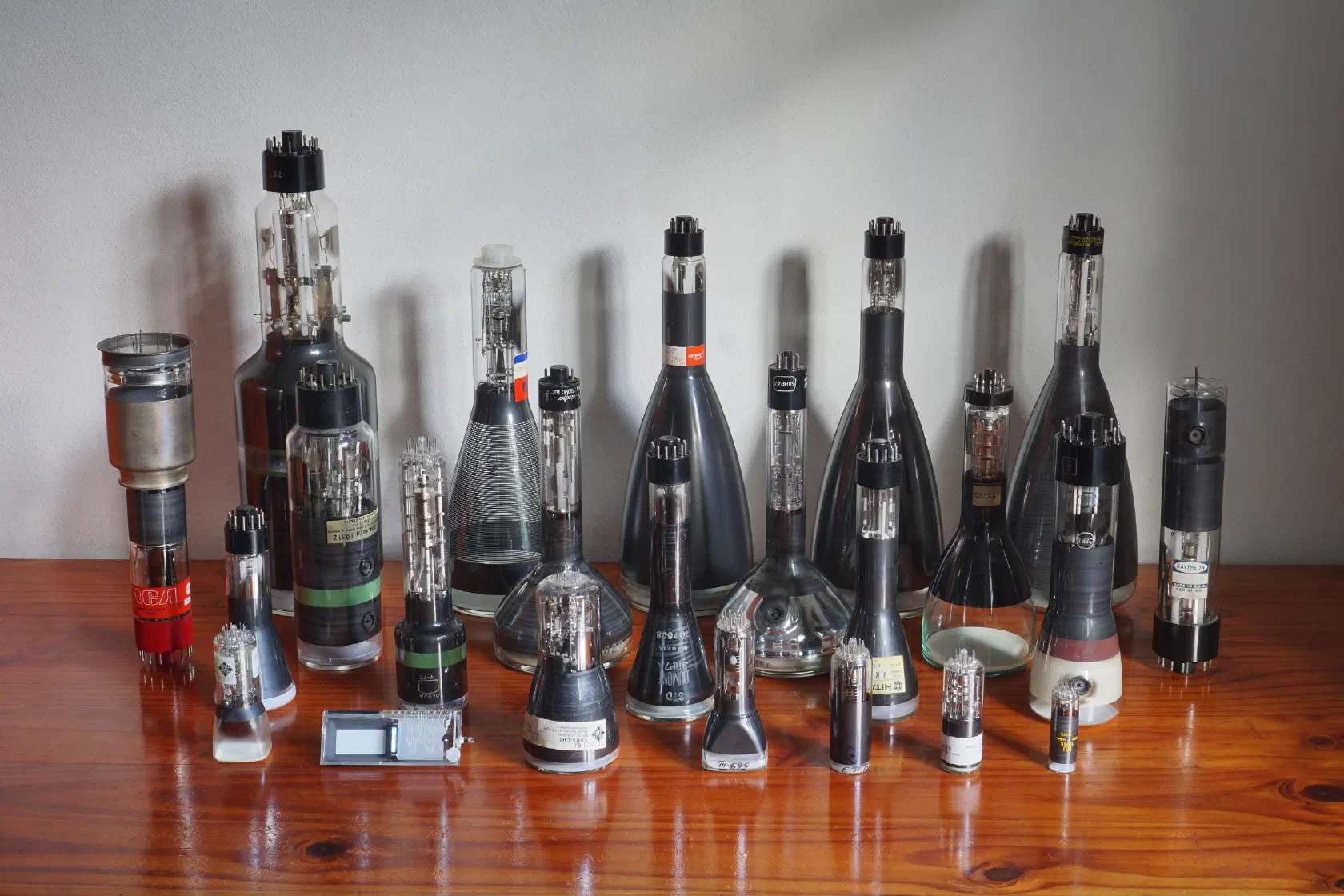 Apart from the two tubes on the far left (RCA 6499 “Radechon” data storage tube) and far right (Raytheon CK1414 “Symbolray” character generating tube), all the other CRTs are monochrome display tubes designed for oscilloscopes, TVs and various other vintage equipments.