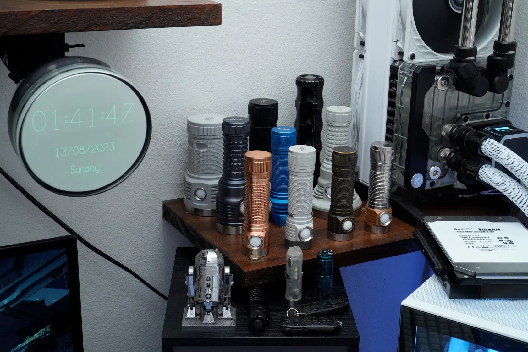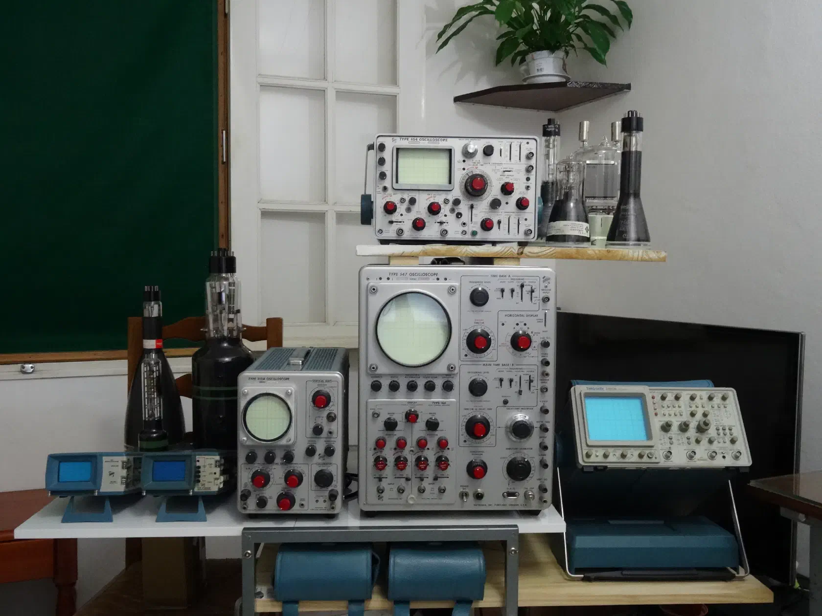 The two right in the center are magnetic, white phosphor (P4) TV tubes, and all the other models are electrostatic, with different phosphor variants (P1 green, P4 white, P7 blue with yellow long persistence, P11 dark blue fast, and P31 yellowish green fast). The two on the front row to the far left are black & white Sinclair pocket TV tubes, one of which is one of a kind, flat with a side electron gun and a very clever beam deflection system. This was made specifically for the Sinclair FTV1 pocket TV.